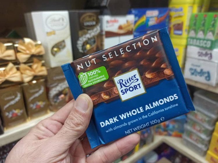 شکلات ریتر اسپرت، شکلات دارک ریتر اسپرت مدل بادام کامل، شکلات Ritter Sport، شکلات تختهای دارک 100 گرمی، خرید شکلات تلخ خارجی