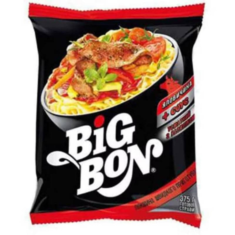 نودل بستهای 75 گرمی بیگ بون با طعم گوشت گاو فلفلی (Spicy Beef) یک میانوعده فوری و پرطرفدار است که بهویژه برای علاقهمندان به طعمهای تند و ادویهدار مناسب میباشد. این محصول توسط برند روسی Big Bon تولید میشود و در کشورهای مختلف از جمله ارمنستان، روسیه و اوکراین عرضه میشود.