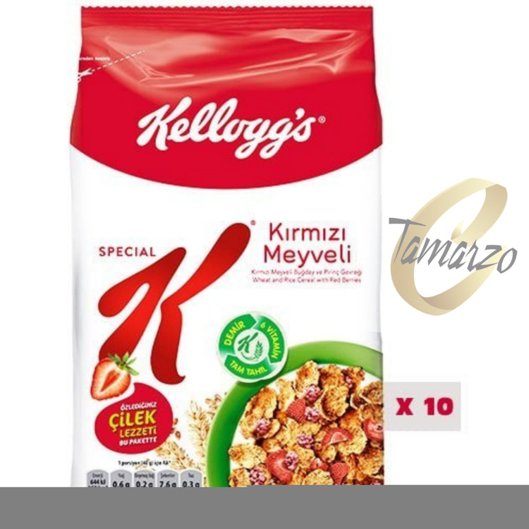 کورن فلکس کلاگز اسپشیال کی رد بری حاوی میوه های خشک قرمز شامل توت فرنگی و گیلاس و تمشک و ساخت کشور آلمان می باشد.